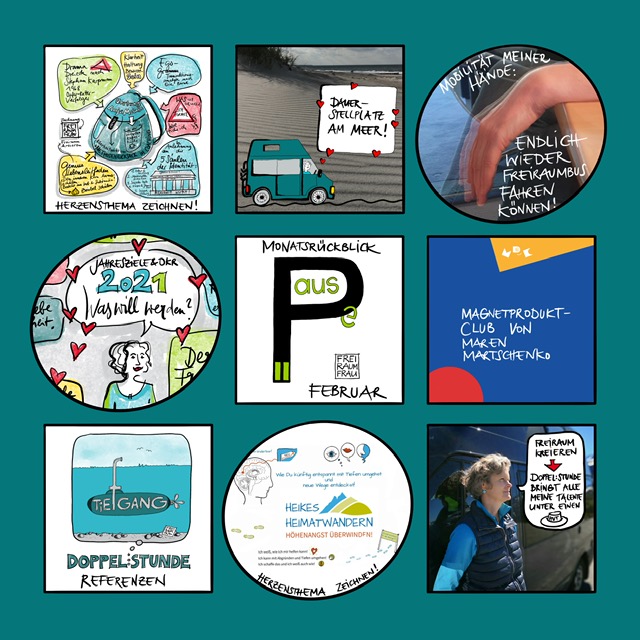 Diese Methode habe ich im Magnetprodukt-Club kennengelernt. Ich feilte ziemlich lange, bis ich meine Jahresziele emotional und anziehend formuliert hatte. Dazu gehörte für mich dann auch noch die visuelle Umsetzung. Meine Zeichnung klebt nun an vielen Stellen in meinem Klarheits-Kalender. Aus diesen Zielen heraus habe ich messbare Quartals-, Monats- und Wochenziele runtergebrochen. Noch nie bin ich so strukturiert und motiviert in einen Monat gestartet. Das behalte ich bei! - Meinen Händen geht es langsam besser.