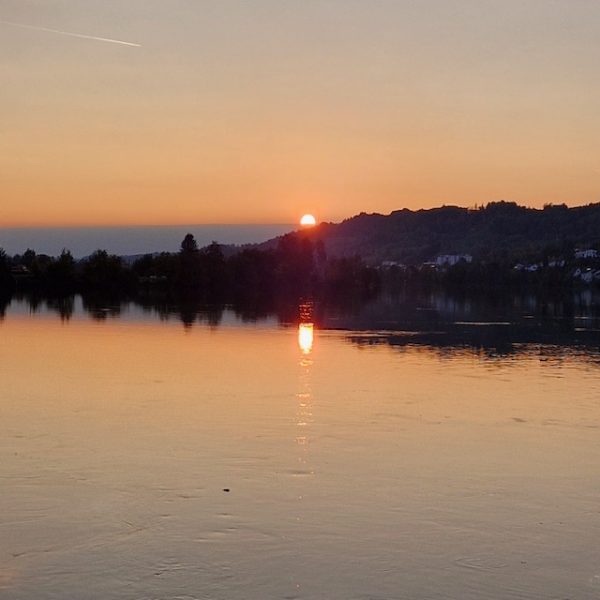 Schöner Sonnenuntergang mit Blick über den Rhein. Sobald die Sonne weg ist, wird es frisch und ich mache mich auf den Rückweg zum Freiraumbus.