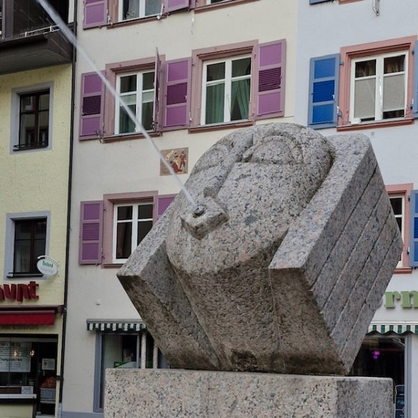 …spuckte diese Skulptur Wasser aus dem Mund in ein Wasserbecken. Ich steige auf einen Klotz um ein schönes Foto zu machen.