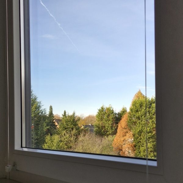 Mein Blick aus dem Fenster. Himmelsblau und Herbstfarben.