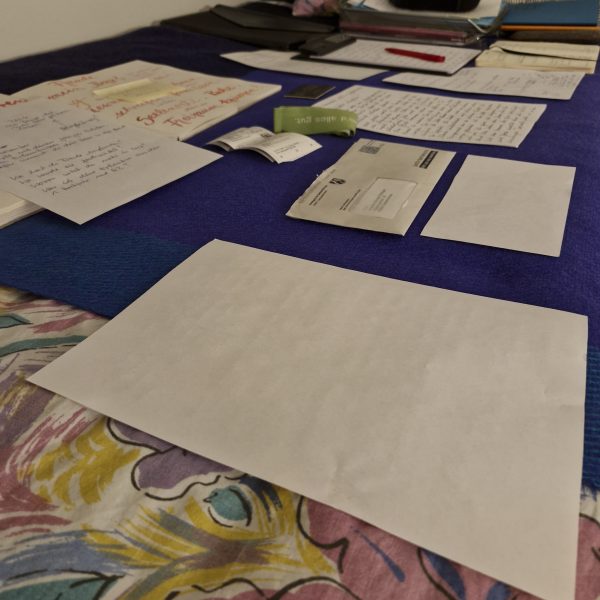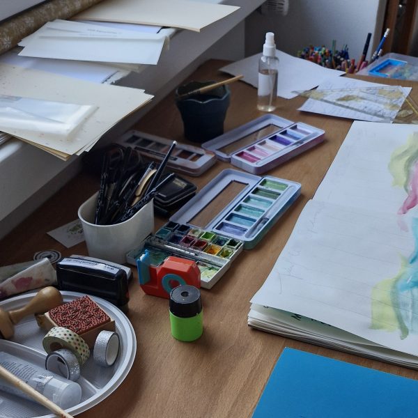 Heute reichen die drei Tische in meiner Wohnung nicht aus. Ich habe an so vielen Projekten gleichzeitig gearbeitet, dass mir der Ablageplatz fehlte. Da musste mein Bett noch herhalten.